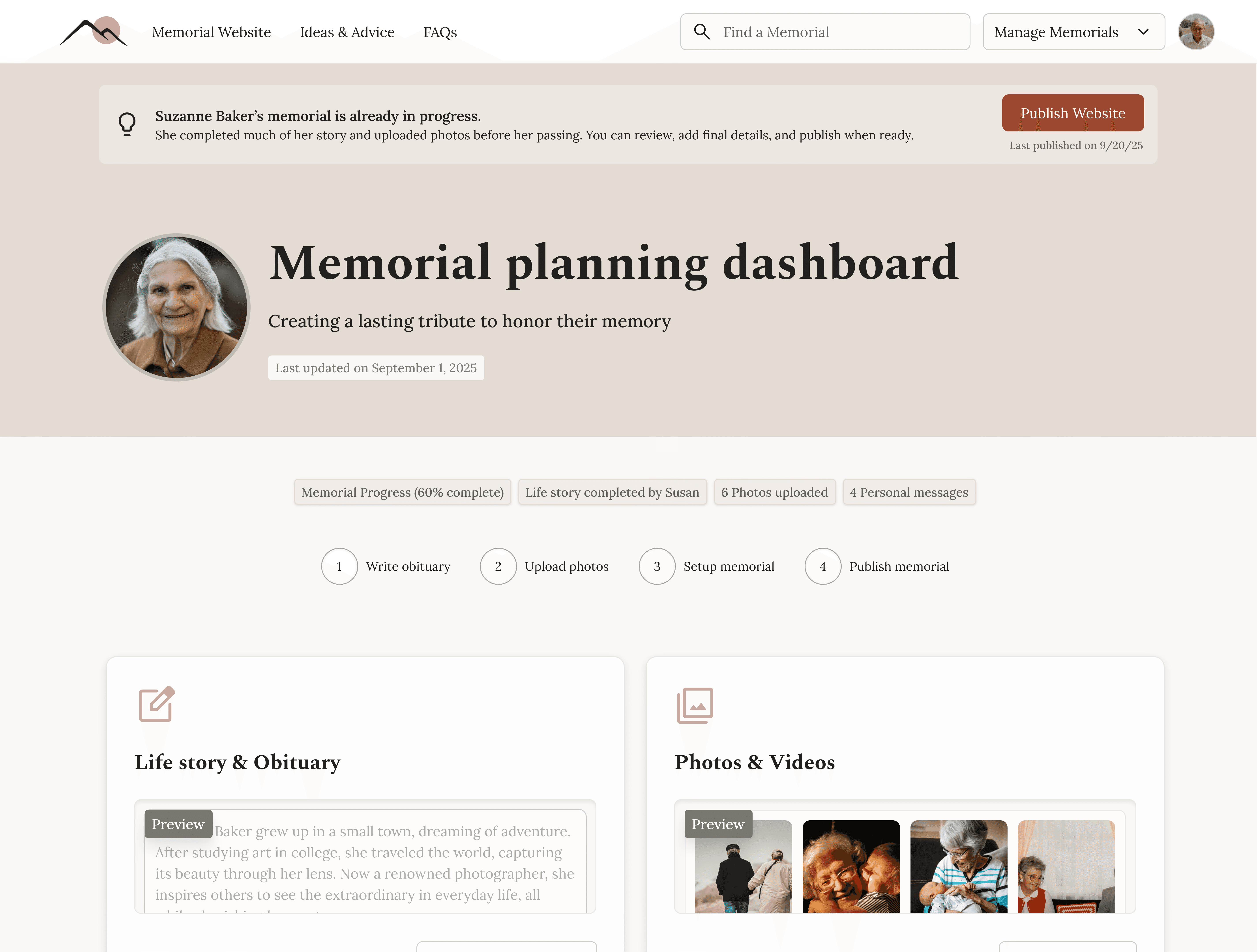 Scroll below to view full Memorial planning dashboard page.