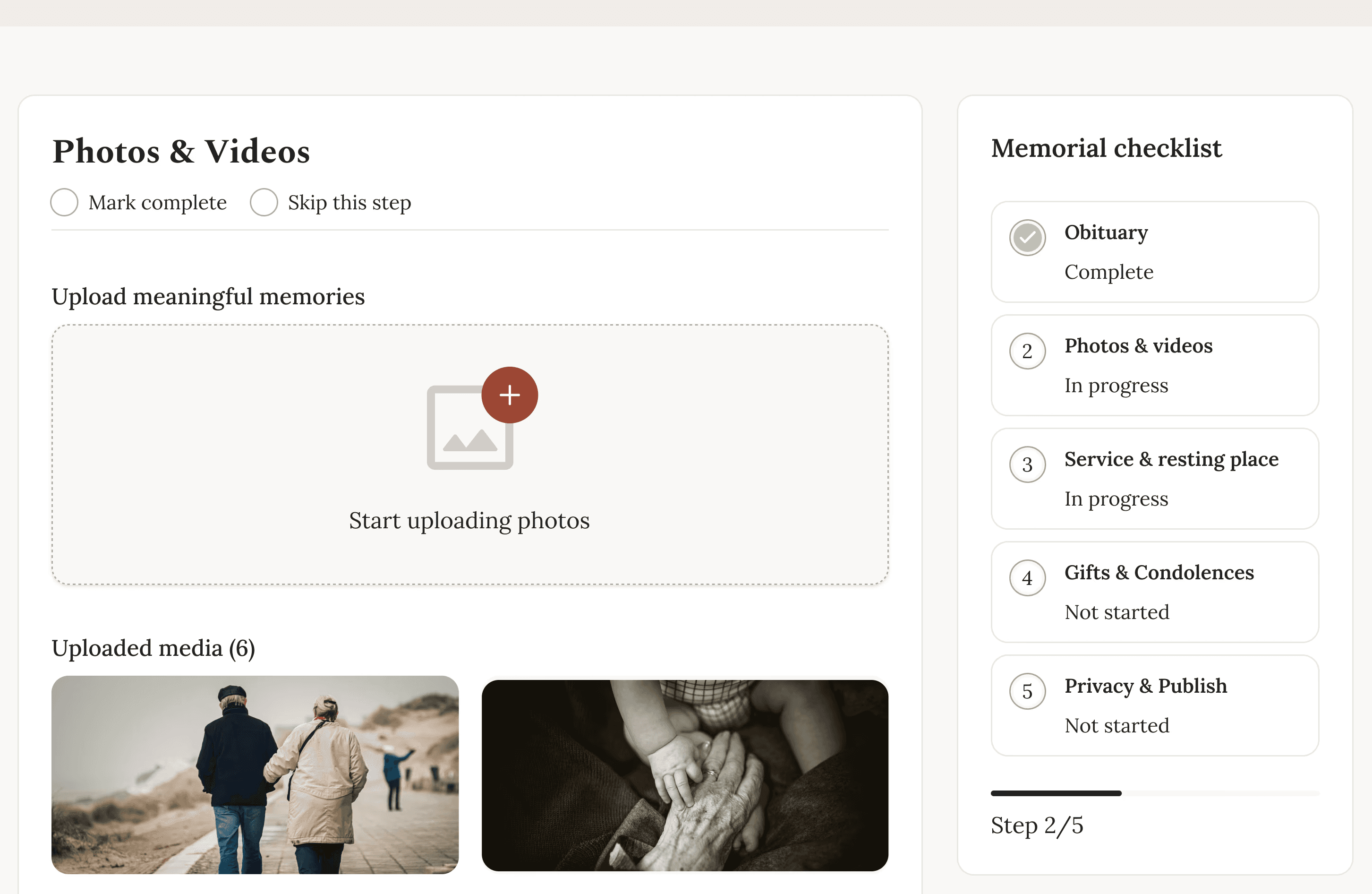 Design decisions prioritized accessibility and cognitive ease: clear language, large tap targets, high contrast, predictable navigation, and progressive disclosure to avoid overwhelming users during emotionally sensitive tasks. Feedback directly informed refinements to dashboard hierarchy, progress indicators, and the memorial viewing experience.